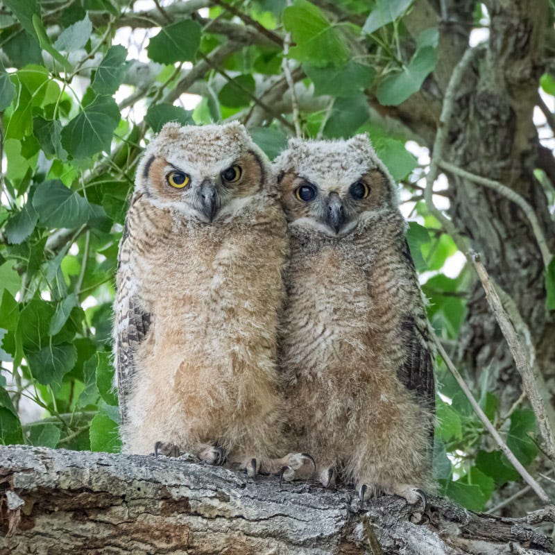 Some of the Owlets have already fledged. They have left the nest and are on nearby branches. They are not able to fly yet and are still covered with some youthful downy feathers.