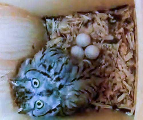And, speaking of Owls, here is an update from my Western Screech Owl nest box: a week ago the HawkWatch International nest survey revealed that there were four eggs in the nest on my porch!