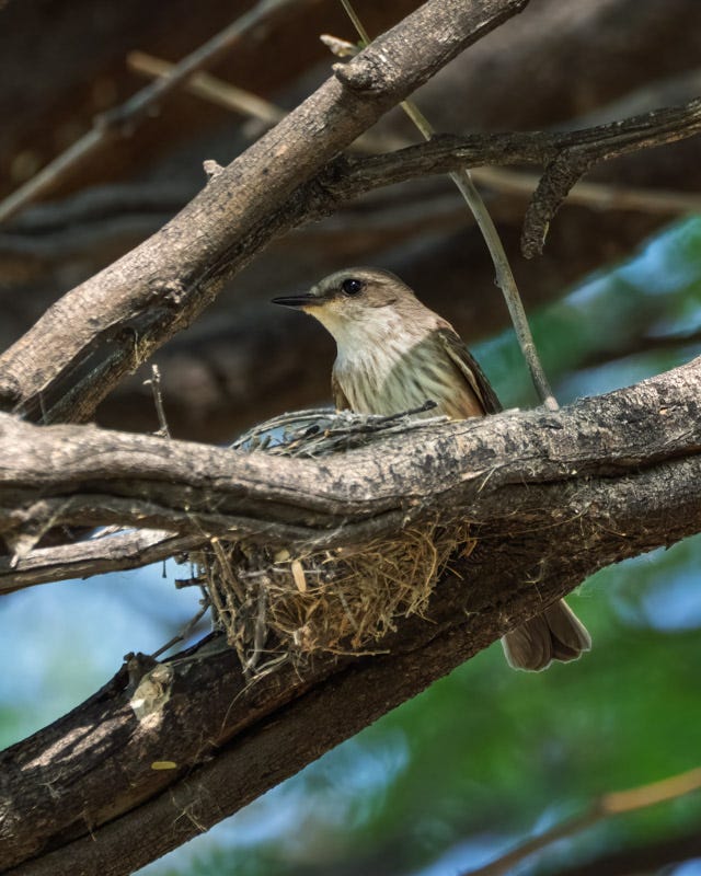 Vermilion Flycatchers are very conspicuous birds that are easily seen in each of Tucson’s parks and fields. However, during breeding season, the Flycatchers build inconspicuous nests that go very unnoticed. I learned about a nesting Vermilion Flycatcher that was in one local park. In the middle of March I saw the female sitting in her nest.