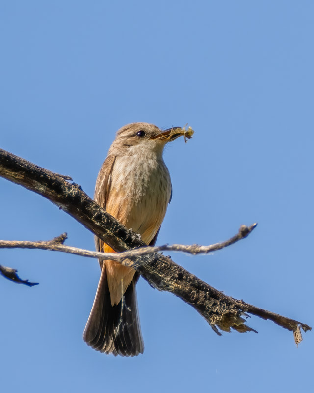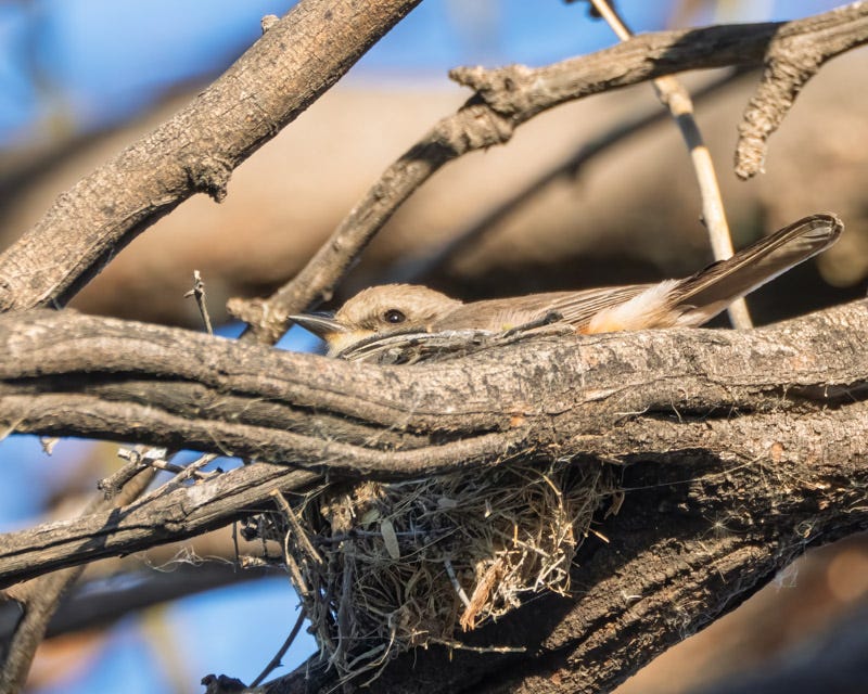 When the young birds have grown some feathers and are able to regulate their own body temperature, the mother bird will then begin to forage for food. This female Vermilion was just as busy hunting for food as the male was. Vermilion Flycatchers feed their young a high protein diet comprised of insects.