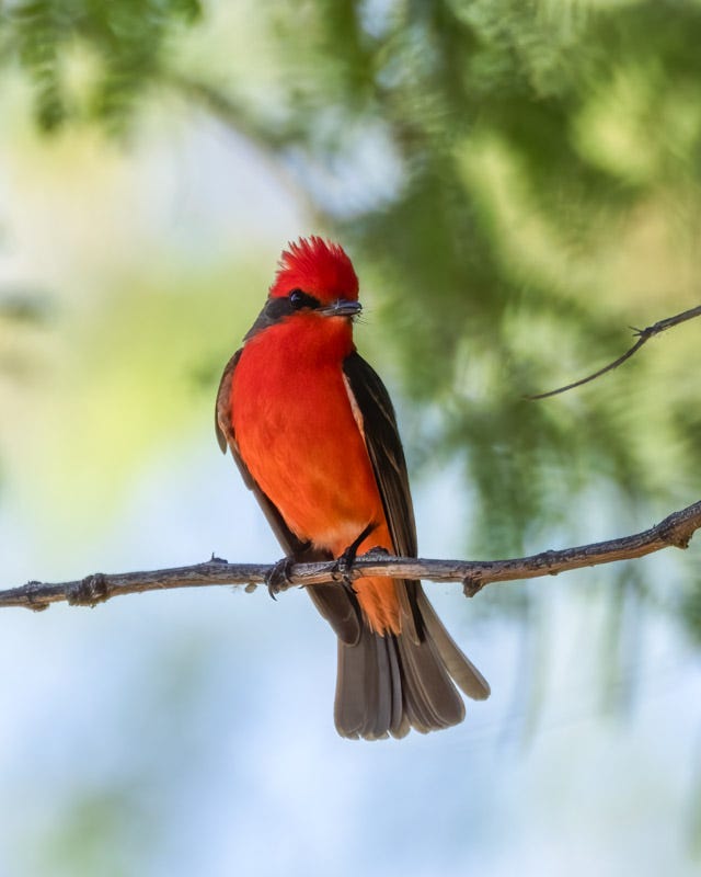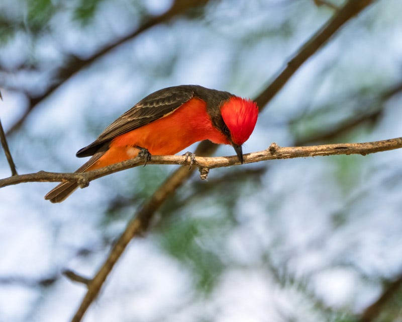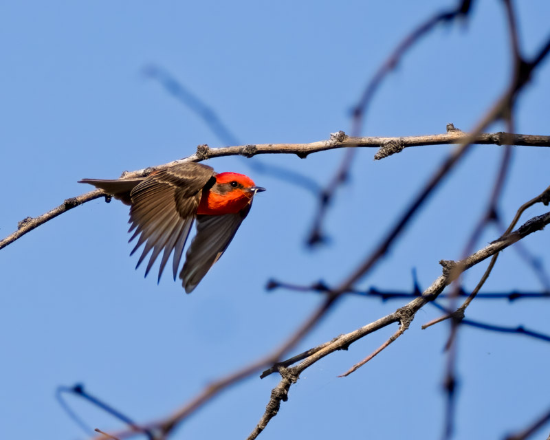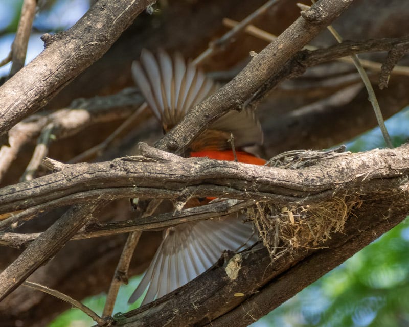 I returned two weeks later at the end of March and was able to watch the male and female birds bringing food to the hatchlings in the nest. Here is the male Vermilion Flycatcher with a very small insect in his bill. When I first arrived at the nest site he was nowhere to be seen. After ten minutes, he showed up and slowly flew from perch to perch, approaching the nest.