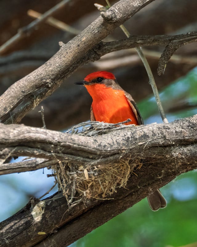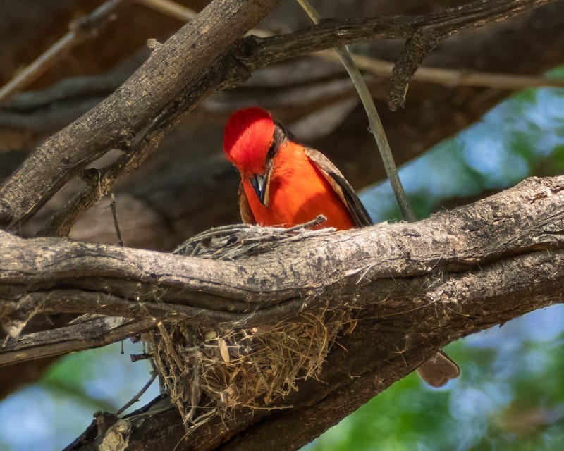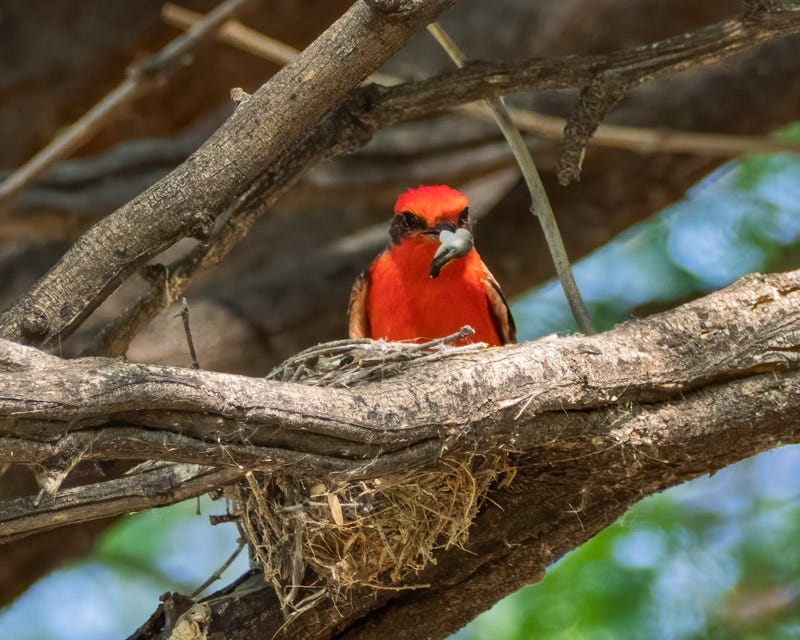 This cycle of feeding the young will repeat itself over and over again. The young birds will fledge (leaving the nest) in about two weeks. The parents continue feeding the fledglings for another few weeks. Often during that time, the male assumes full responsibility for feeding the young while the female may begin initiating a second brood of Vermilion Flycatchers.