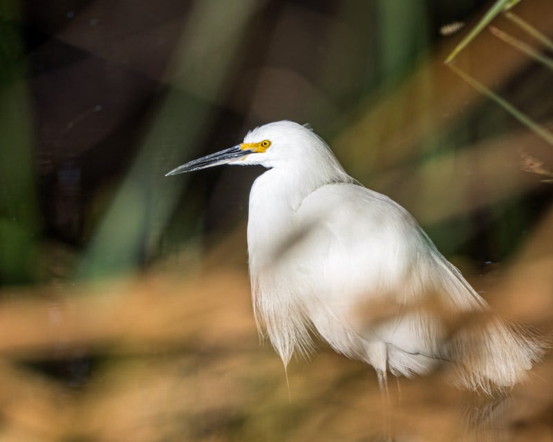 When I first arrived at Sweetwater, a pair of Snowy Egrets were flying around in a courting display. Every few minutes they would appear in the sky flying together. They would then disappear and land somewhere in the wetlands. Towards the end of my walk, I saw one of the Snowy Egrets in the water to the side of the trail. Hidden by foliage, it was standing around and not feeding and showing the long breeding feather plumes draped off of its head and back.