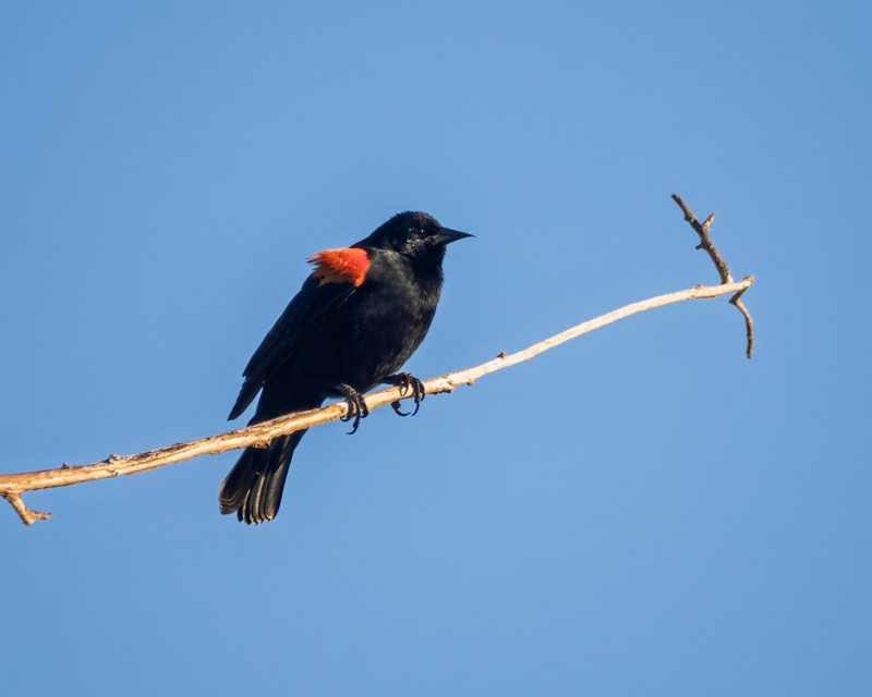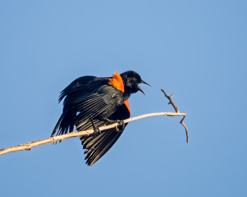 This male continued to creep towards the end of this branch. He would stop every few inches to sing and flash his red shoulder patches. Those red shoulder patches, called epaulets, serve as a visual symbol of strength, status and age.