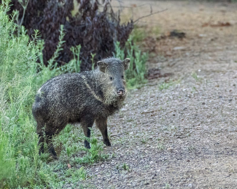 Javelinas do not have good sight. They rely on their sense of smell and their hearing to assess the world around them. This Javelina paid attention to me for a few seconds before it felt safe enough to cross the path and join the rest of the herd,