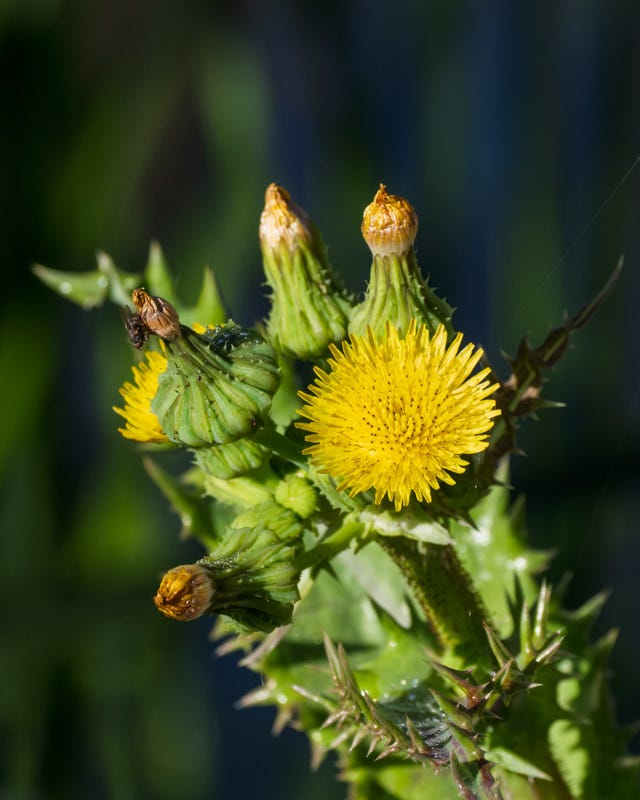 I saw many examples of an interesting plant while I walked around Sweetwater. The plants either had bright yellow flowers or snowy white seed puff balls. I had to research the plant and found that it is called Prickly Sowthistle. Its name comes from the spiny, thistle-like leaf edges. It also has a thick milky sap that oozes from the leaves and stems when they are cut. Historically it was used as feed for lactating pigs (sows) when people thought that the milky sap would aid in milk production. That’s how “sow” came to be part of its name.