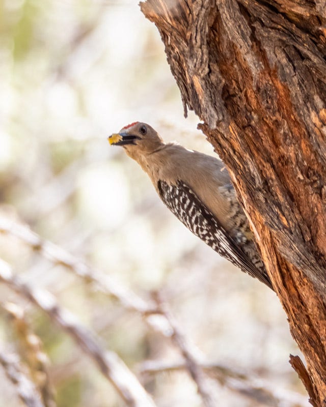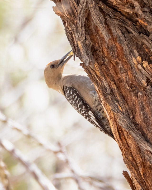 Another desert bird in my yard is the Gila Woodpecker. Gila Woodpeckers are large birds that are very vocal, always calling for attention. It found some kind of food, either insect larvae from the tree or some snack from the nearby suet cake.