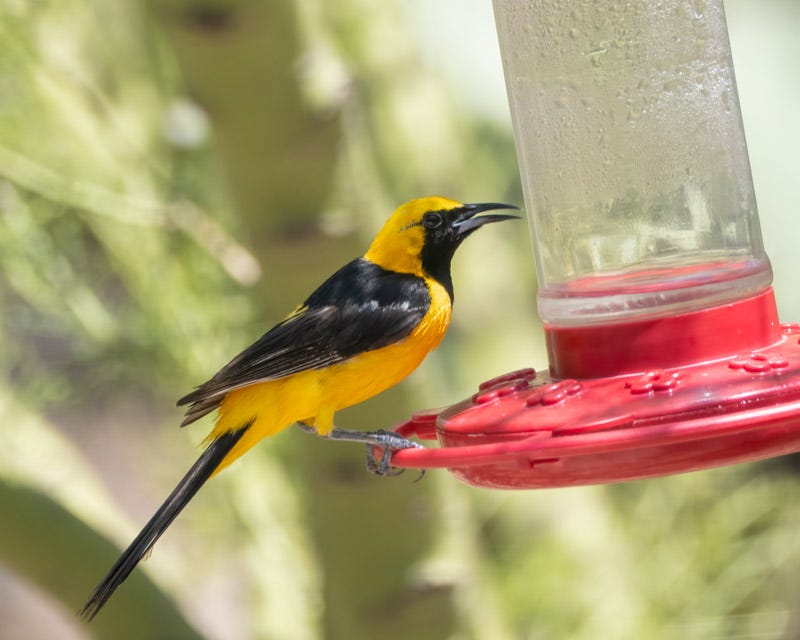 Last summer I saw a few glimpses of Hooded Orioles. They nest in the Tucson area under the leaves of fan palms. I learned that a friend one street up from me had a Hooded Oriole in his yard so I put out an "oriole feeder." Oriole feeders look like hummingbird feeders but the portholes are larger to allow the Oriole's large bill to reach inside to get to the nectar. The Hooded Oriole pair have become regular visitors to my feeder! The male is a striking bird! It is called a Hooded Oriole due to the yellow/orange "hood" on its head.