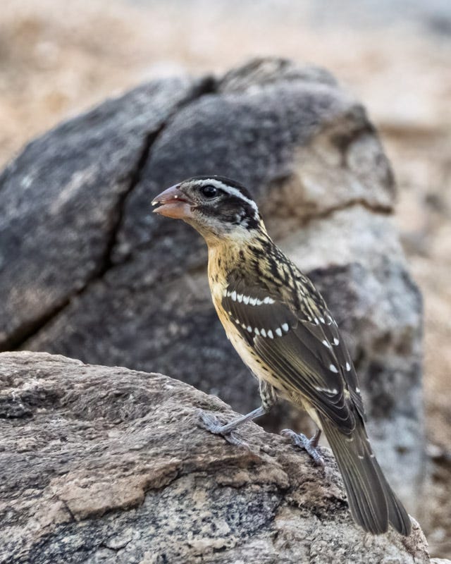 One of the Black-headed Grosbeaks flew down to a large rock after feeding. I think my birds are immature males that hatched this spring. Their plumage is not dark and bold like an adult's would be- it won't be until next summer that this bird will have its full adult plumage. During the winter months, this bird has an interesting diet, as Birdnote tells us.