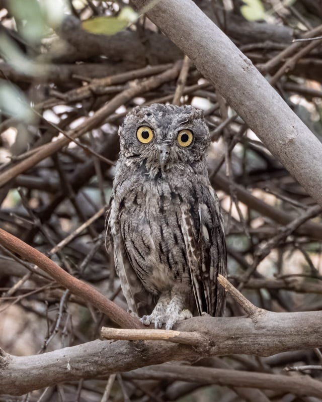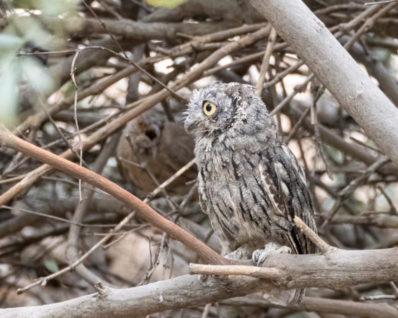 I had a family of Western Screech Owls in the nest box on my back porch this year. As has been the case in past years, once the young owlets fledge, the family moves somewhere in the neighborhood but I never see them again. One recent afternoon I saw a Gila Woodpecker make a strong flight towards my kitchen window. I went outside to see what happened to it and found an Owl that the Woodpecker had been angry at. I went back inside the house and watched the owl through the kitchen window for a minute or so but then the Owl flew off and into a nearby jojoba bush. I waited for a bit, and then went out to look for the owl from a distance. I spotted it on a low branch. When I processed the photo, I saw that a Curve-billed Thrasher was behind the Owl yelling furiously at it!