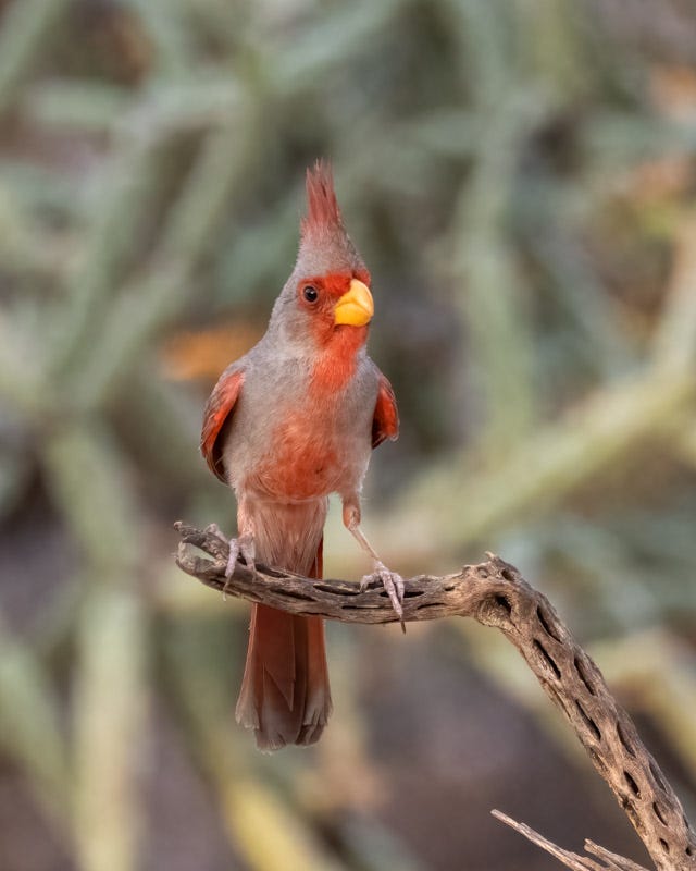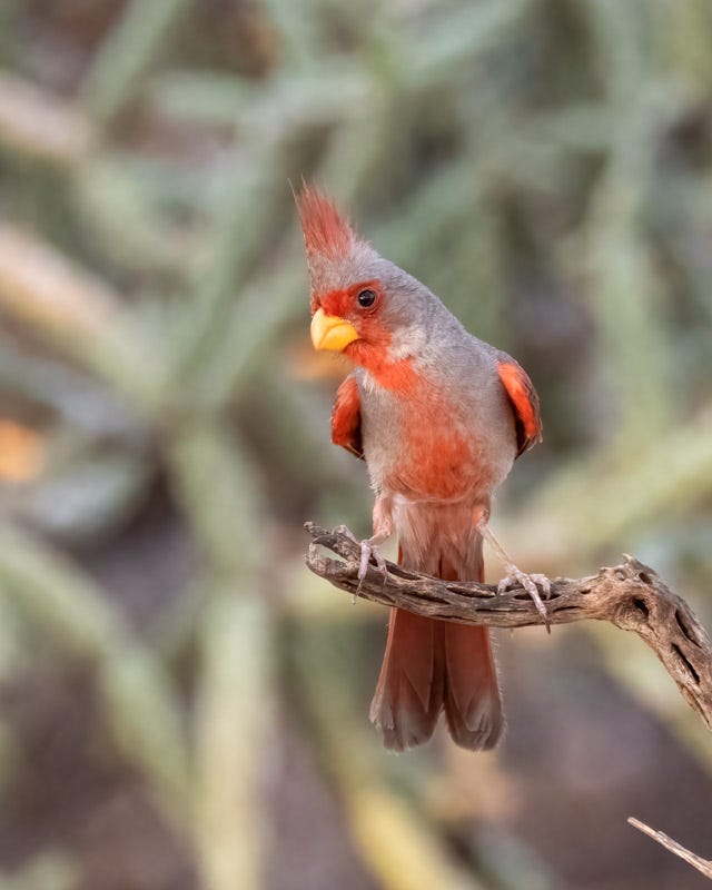 The Pyrrhuloxia is a favorite desert bird. It looks like a Cardinal with its crest and red feathers, but is very different. The Pyrrhuloxia (pronounced pie-ruh-lock-seeya) is a bird of the dry Southwest deserts. The Cardinal preferes more diverse habitats.