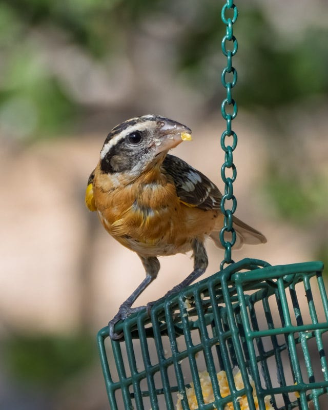 I am very excited to see that a pair of Black-headed Grosbeaks have been spending a few weeks in the neighborhood. They come to my feeders enough so that I see them every few days. They visit the feeder with fatty suet cake.