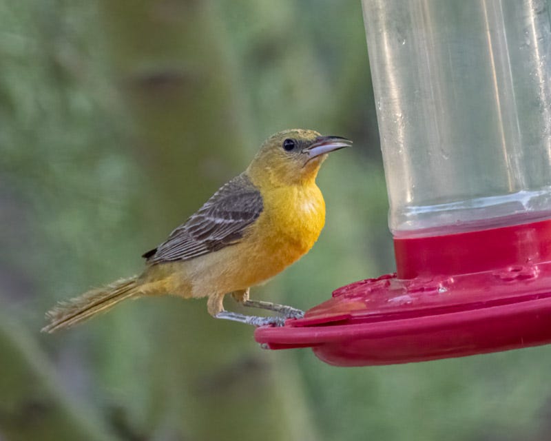 Here is the female Hooded Oriole. I would have liked to have taken some photos of either Oriole on a natural perch but these birds seem to fly to the feeder without perching nearby. Once they finish dining, they fly off into distant trees. I have yet to even see them perched in a nearby tree. Perhaps one day!!