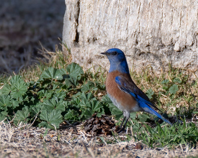 Another Western Bluebird hopped next to the base of the palm tree in search of food.