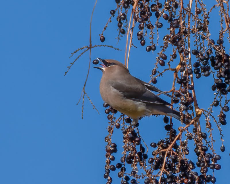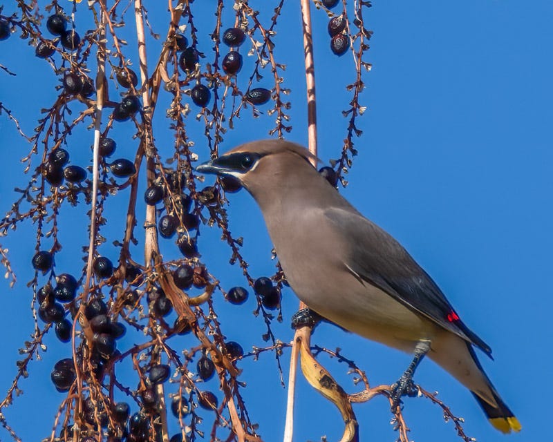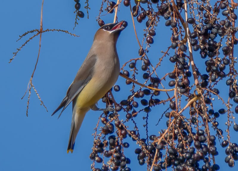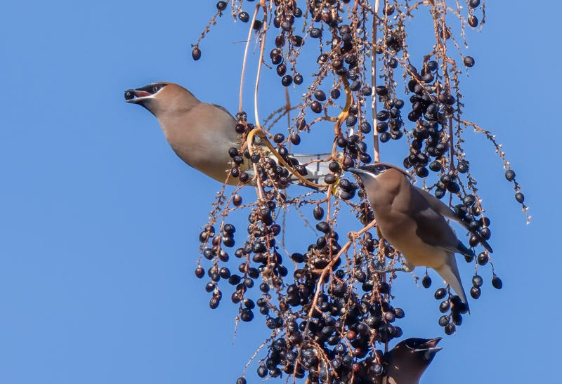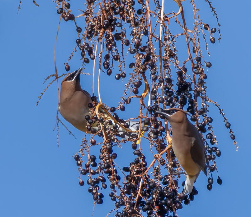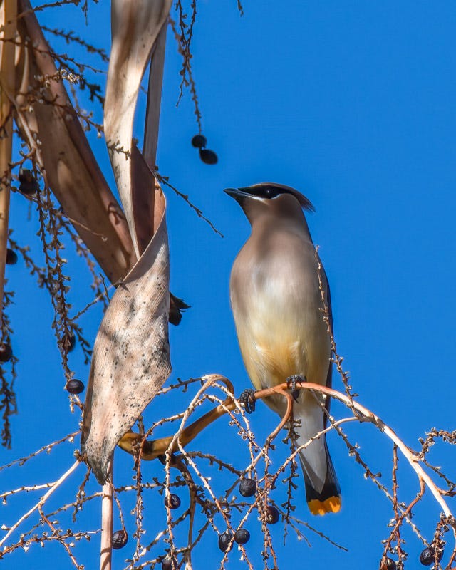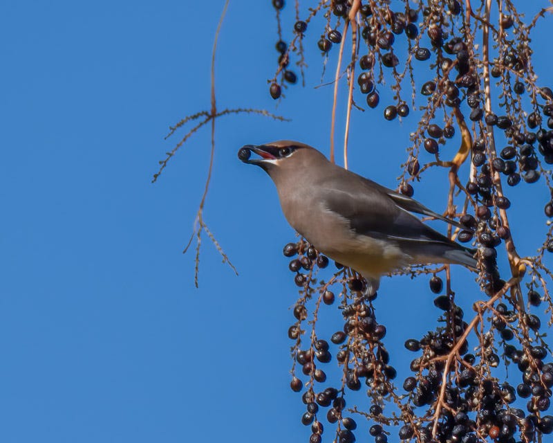 Cedar Waxwings in Tucson also dine on the fruit of the palm