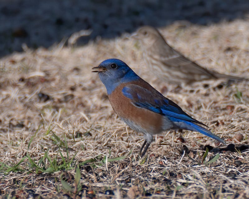 The park had a few other birds around. Western Bluebirds never seemed to land in the palm tree but would fly over and perch in a bare tree next to the palm. The Bluebirds would fly to the ground to glean fallen berries from the grass on the ground. Here one Bluebird has just swallowed a berry. You can see the bulge in its throat.