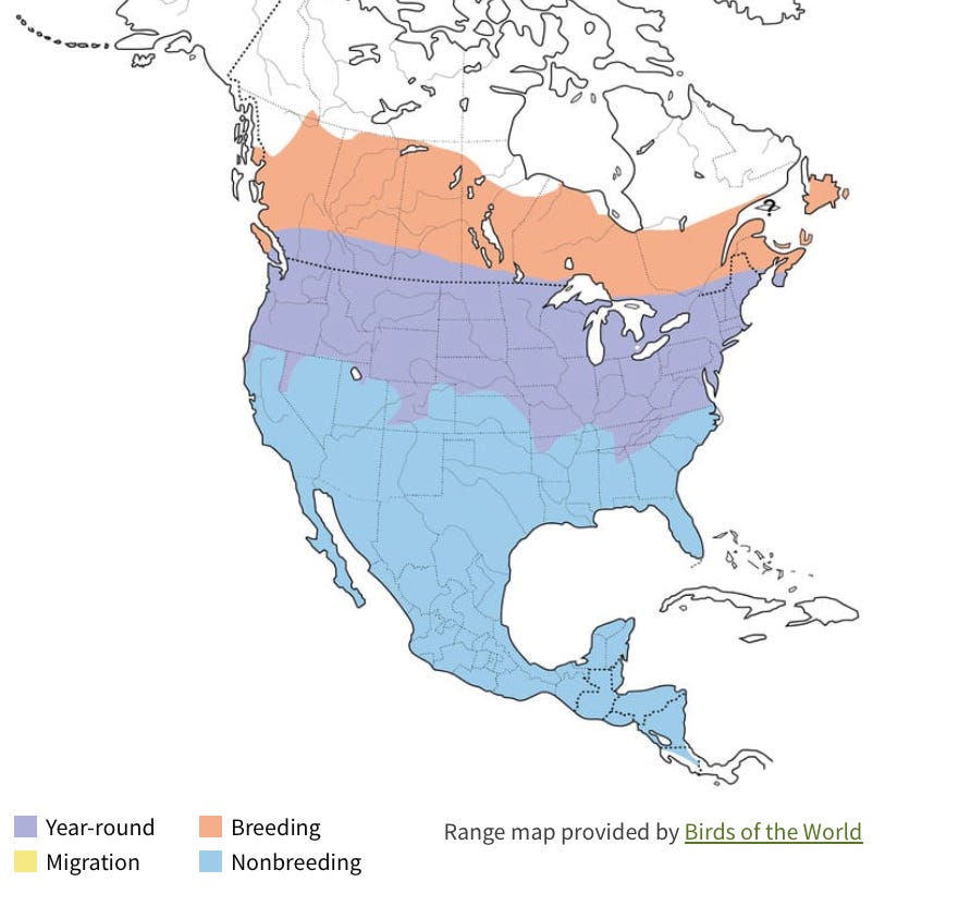 The range map shows how widespread Cedar Waxwings are. They live year-round in the upper half of the United States and breed far north into Canada. During winter, many of the Cedar Waxwings travel south and can be found throughout the entire United States.