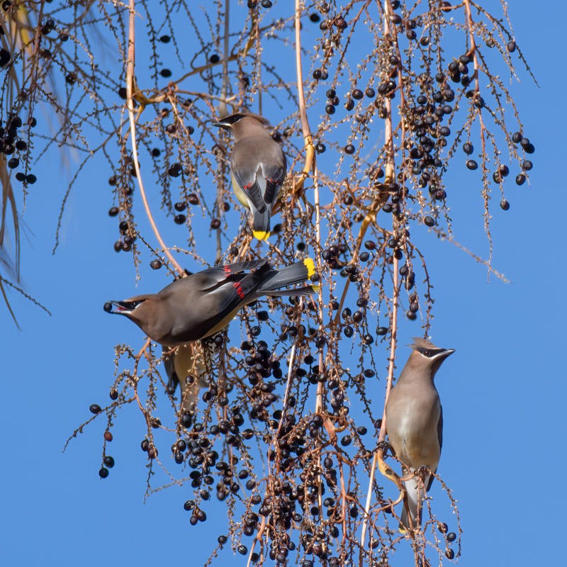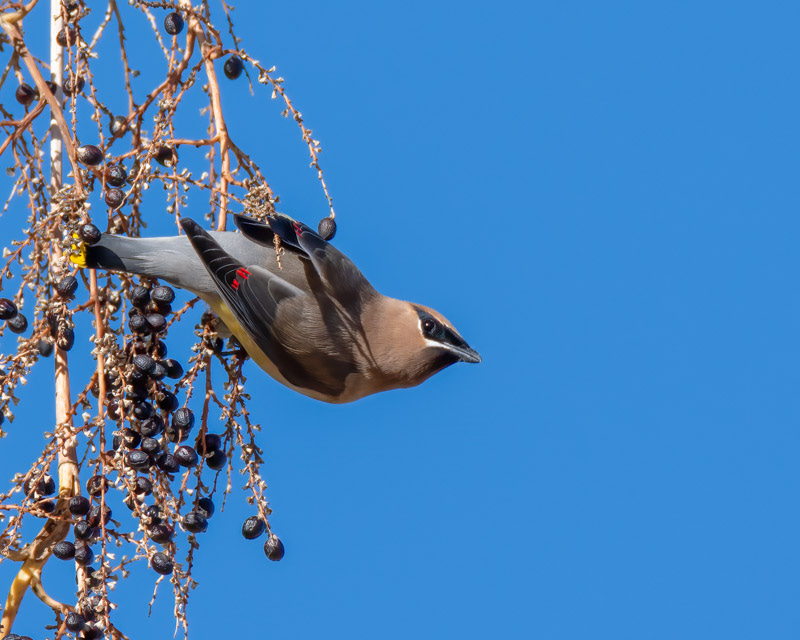 So many berries to choose from. The small flock of Cedar Waxwings would swarm to the palm tree, spend a while eating berries, and then all flush from the palm tree and fly to another corner of the park to perch and rest in a different tree. In this case, they would fly to a fir tree in the corner of the park. After several minutes, they would all fly back to the berry clusters in the palm tree and dine once more.