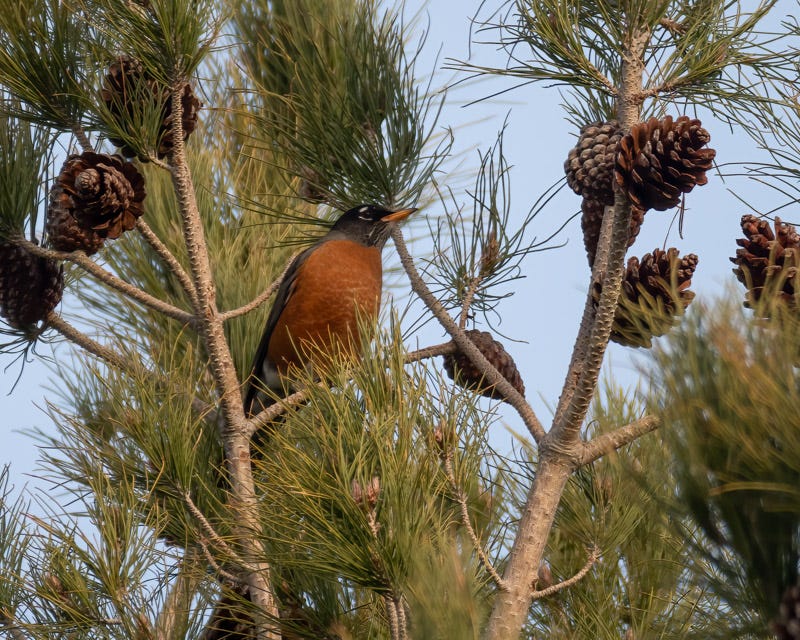 In December, I had seen a large flock of Robins on the Sewailo Golf Course. Here is one brightly colored bird in a pine tree.