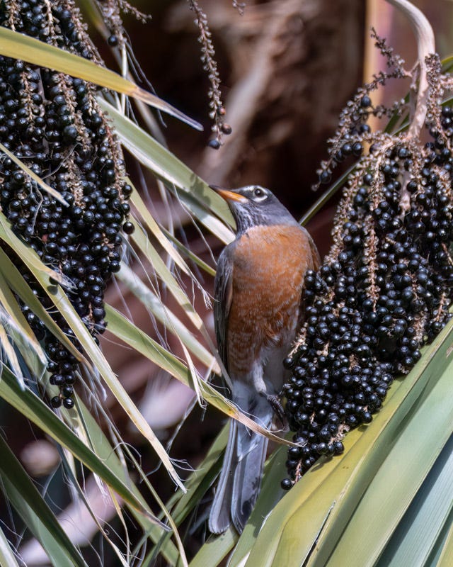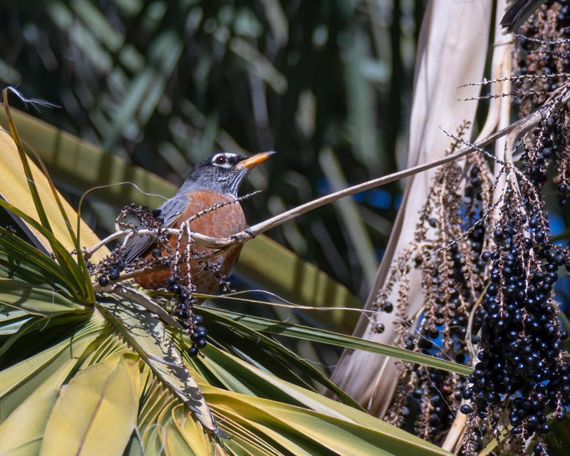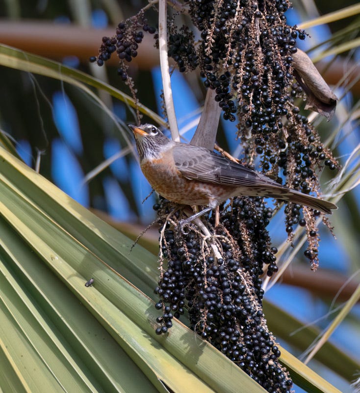 The Robin settled on the top of the fruit cluster. This fruit has a name. These are “drupes”. Drupes are fleshy fruit with a thin skin around a central stone. Think of plums or peaches or almonds. Most palm tree fruit are drupes including coconuts and dates. I’m not sure what type of fruit these palm trees had but there was plenty to eat for the birds.