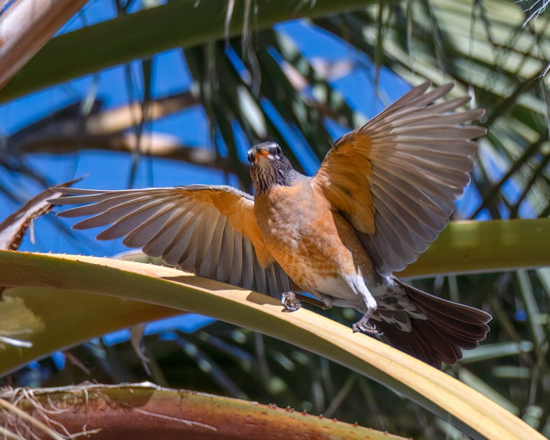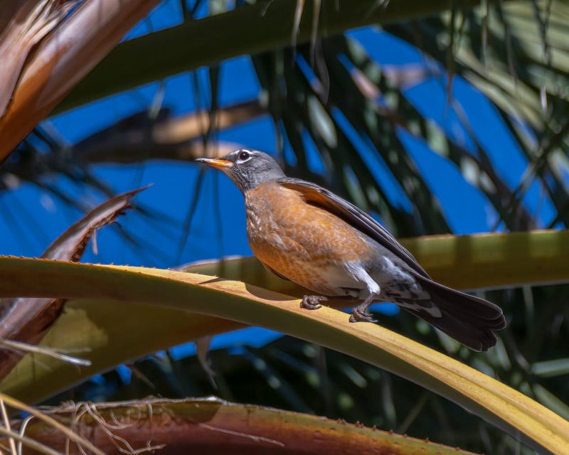 As I watched the Robins, I could see them flying into the palm trees from residential yards across the street. They would disappear into the back side of the palm trees, remaining beyond my view for a few minutes, and then all fly back towards the residential areas bordering the park. One bird finally perched on my side of the palm tree (above) and then surprisingly, turned around!