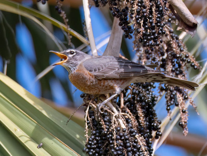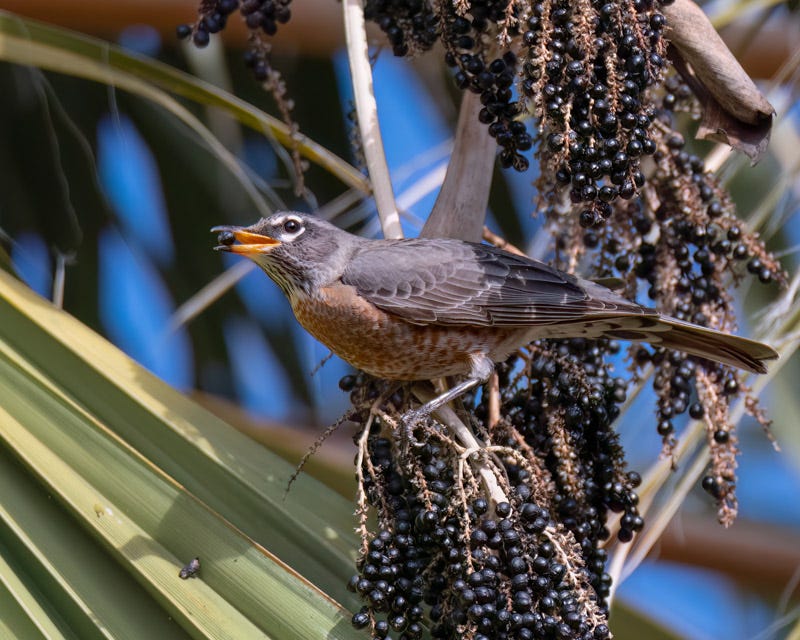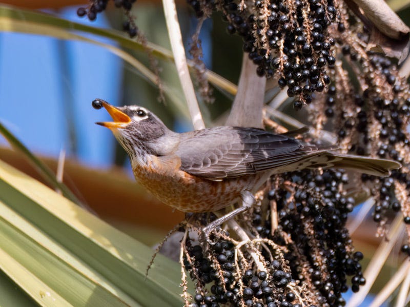 What is this Robin doing with the fruit of a palm tree? Don’t Robins eat worms? That’s what we’ve heard all along. In the summers, Robins will feed on earthworms and grubs. During wintertime, they feed on berries and fruit.