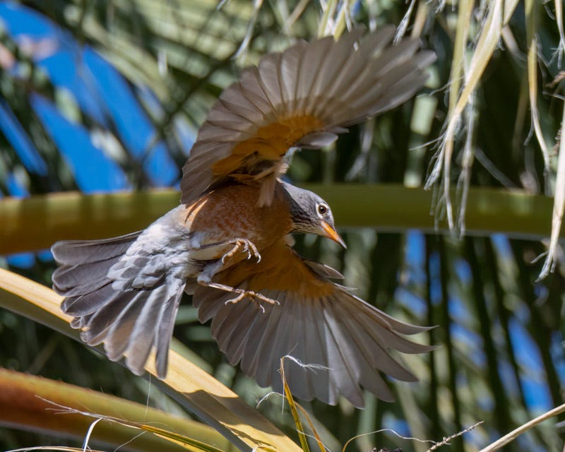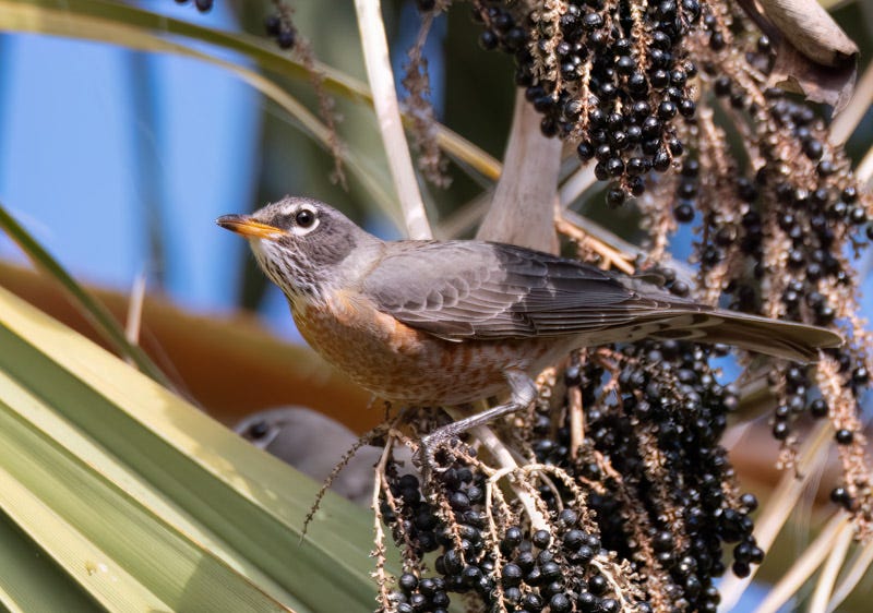 2023 has been a very good winter for American Robins in Tucson. Large groups have been seen in various parts of the Tucson Valley. One particular group has been seen regularly at Reid Park, where they are feasting on the fruit of palm trees lining a boundary street to the park.