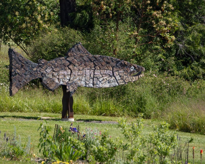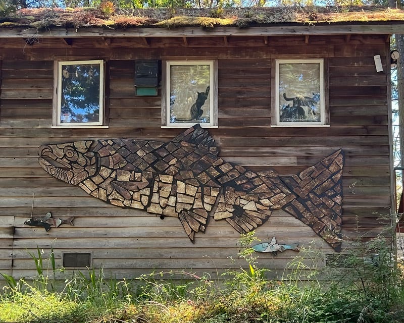 Salmon played a crucial role in the history of the San Juan Islands. Salmon were vital to the culture and economy of the Coast Salish people. Abundant Salmon runs provided a major food source and sustained a later Salmon industry. This large wooden Salmon sculpture was on the side of a building at the Alchemy Art Center near Friday Harbor.