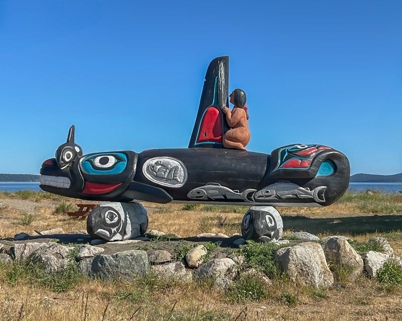 The totem pole represents Tokitae, who in 2023 was the last remaining area Orca still held by an aquarium. To read about her and the story behind the totem pole, see the Seattle Times coverage. It is a powerful story.