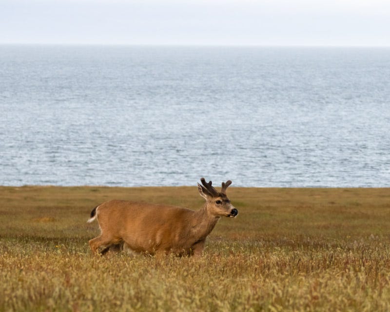 Black-tailed Deer are native to this island and others, and are known swim from island to island. One morning we saw several small groups of deer feeding. This male was crossing the “prairie” at the south end of the island. You can see the water beyond South Beach at the edge of this prairie.