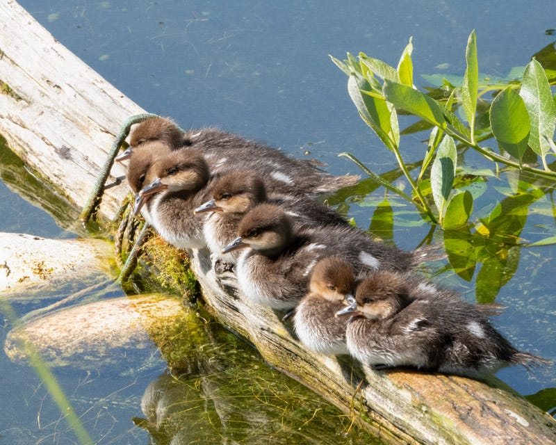 At a Sculpture Garden in Roche Harbor, a Hooded Merganser swam close to her seven ducklings that were all lined up on a log.