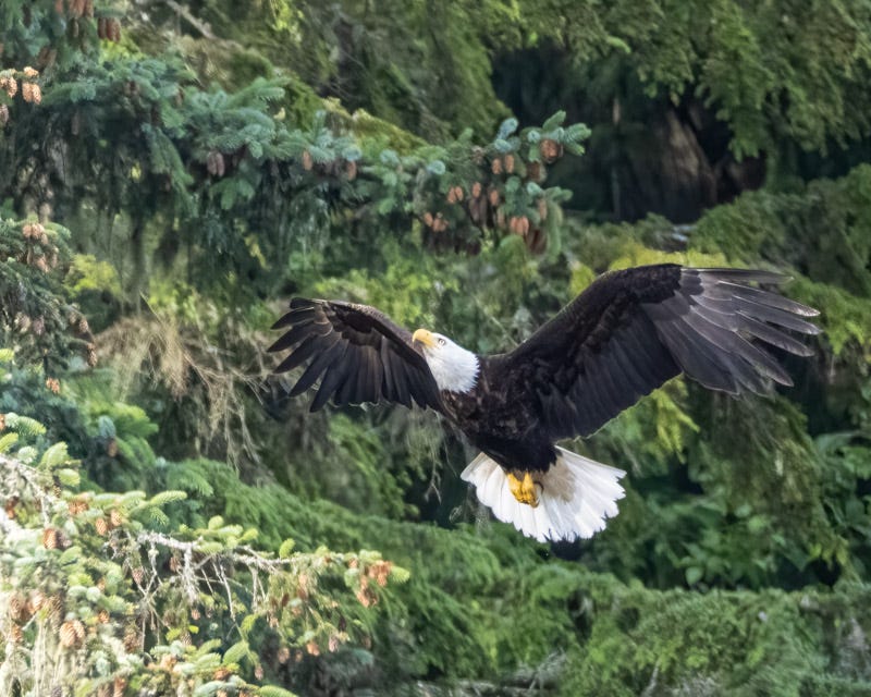 There were Bald Eagles on the island. We saw one in a quiet lagoon. It had made a pass over the lagoon, possibly in search of a fish, and ws flying up to a roost spot near the top of a pine tree.