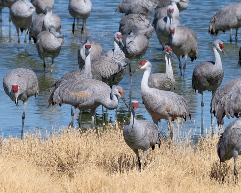 An immature Sandhill Crane can be seen among this group of adults. The bird with the light, rusty/brown crown is an immature Crane. By the end of this first winter, this young bird will have developed its red crown.