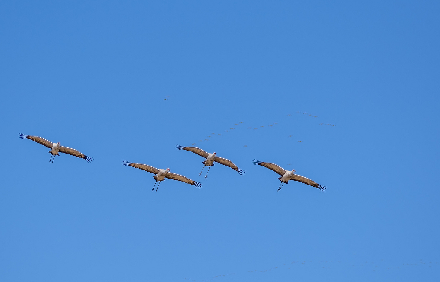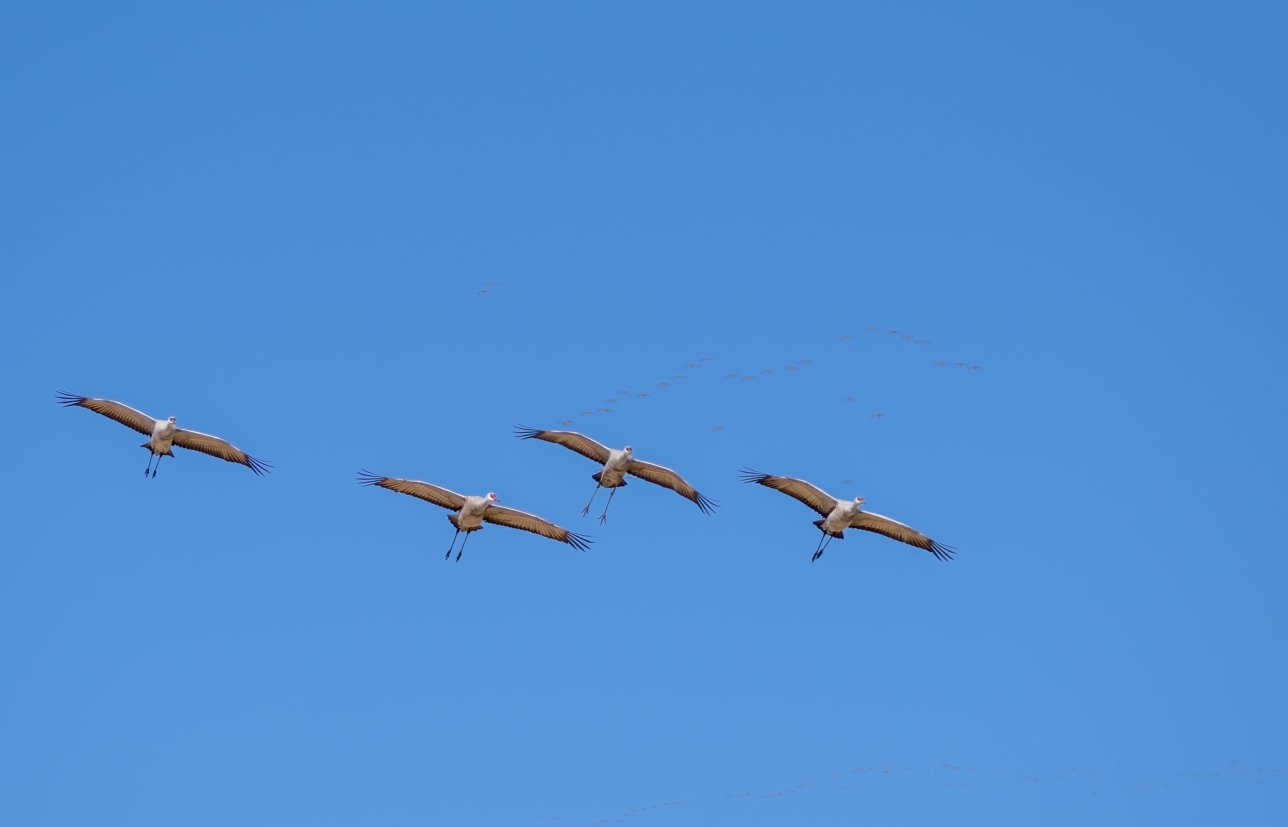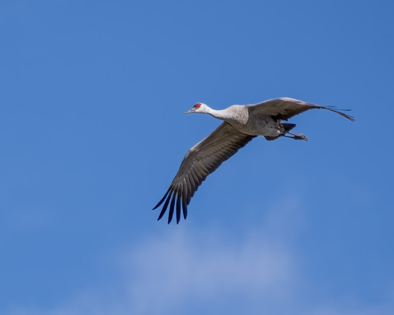 The Sandhill Cranes fly with their legs behind them. Once they decided on a landing spot, they would lower their legs and lower their heads, aiming for the ground. Sandhill Cranes have a wingspan of about 6.5 feet and are four feet long (measured from tip of the beak to end of the tail).
