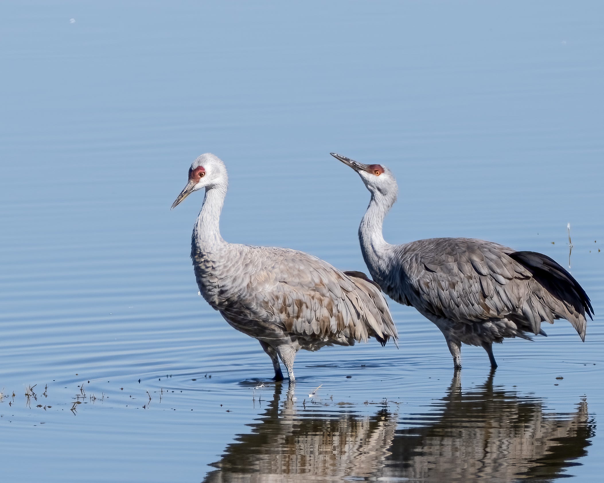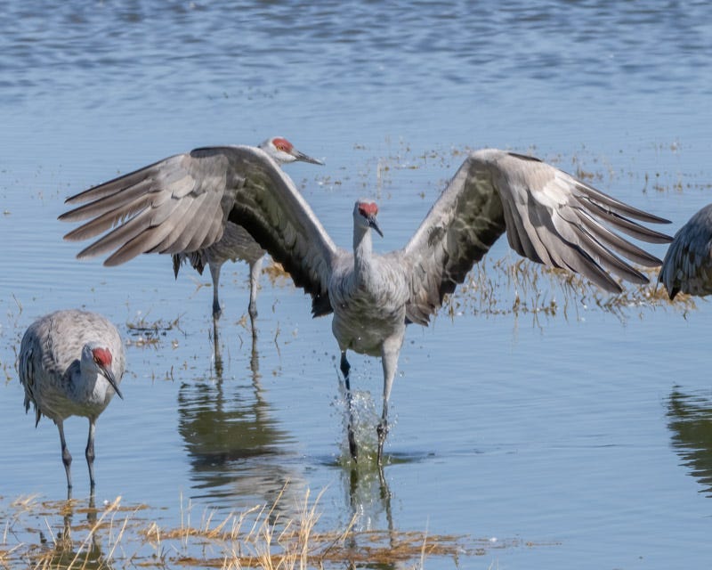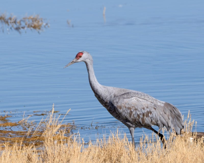 Sandhill Cranes are gray birds that may have a rusty wash on their sides. The adults have droopy feathers on their tail that form a 'bustle'. Adult Sandhill Cranes have a red face and crown.