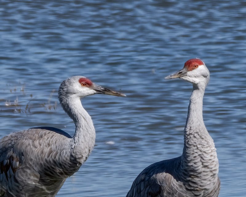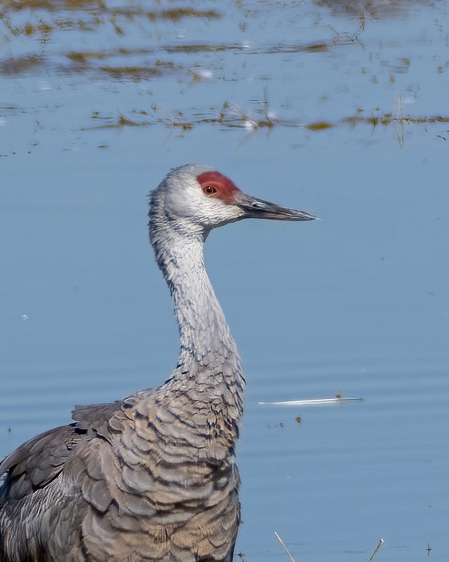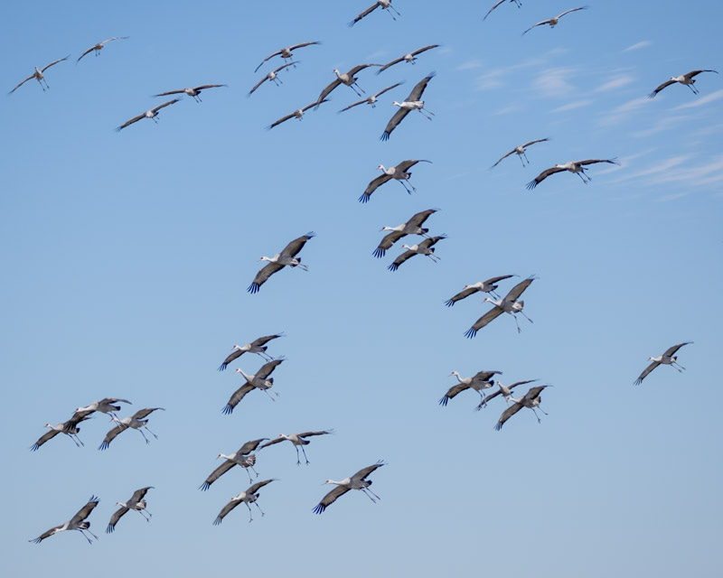 ...and then looked up in the air to see flocks and flocks of Sandhill Cranes approaching the lake. At sunrise, the Cranes fly out to area farm fields to feed on corn and other agricultural waste grains. What we were seeing was the many Cranes that return to the shallow water at midday for a short break.