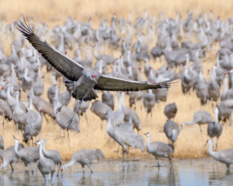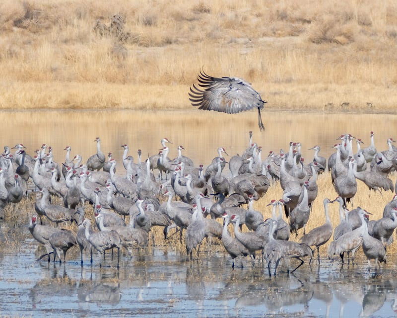 Among a crowded grassy island or in shallow water, there is room for many more cranes. Each incoming Sandhill Crane spots a desired landing spot and, with its head lowered behind its wing feathers, drops right down on the exact space it was aiming for.