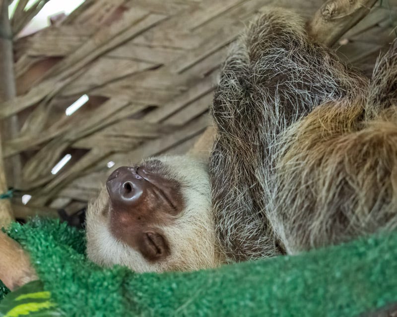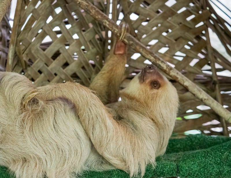 In Panama we visited the Gamboa Sloth Sanctuary. Run by the Pan-American Conservation Association, we learned about the Hoffman’s Two-Toed Sloths they have there. Also known as the Northern Two-Toed Sloth, this species has just two toes on its forelegs. It has a long snout. It also has no hair on the soles of its feet.