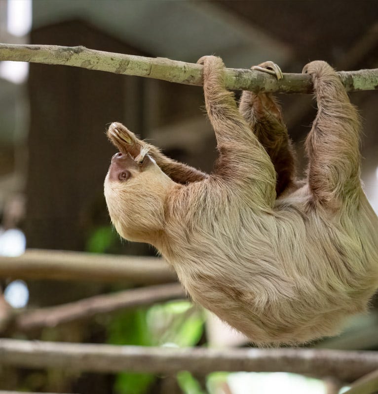 Sloths spend most of their lives hanging upside down. We watched the keepers feed a few of them a flower. Not only do Sloths move slowly, they have the slowest metabolism of any mammal. They have a four-chambered stomach that can take up to a month breaking down and digesting tough, fibrous leaves. BBC Earth has more on these fascinating animals.
