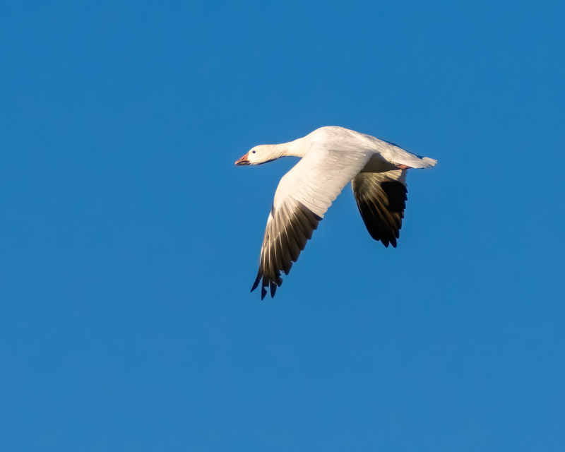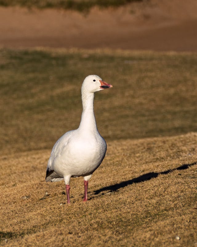 I saw what was probably the exact same bird almost one year ago to the day. Here is the link to my newsletter from December 2024. At that time, one year ago, this Snow Goose was a first year bird. It still had many gray feathers. This year, at the age of 1 1/2, it has come into its full adult plumage and is a snowy white which is set off by the black feathers on its wings.