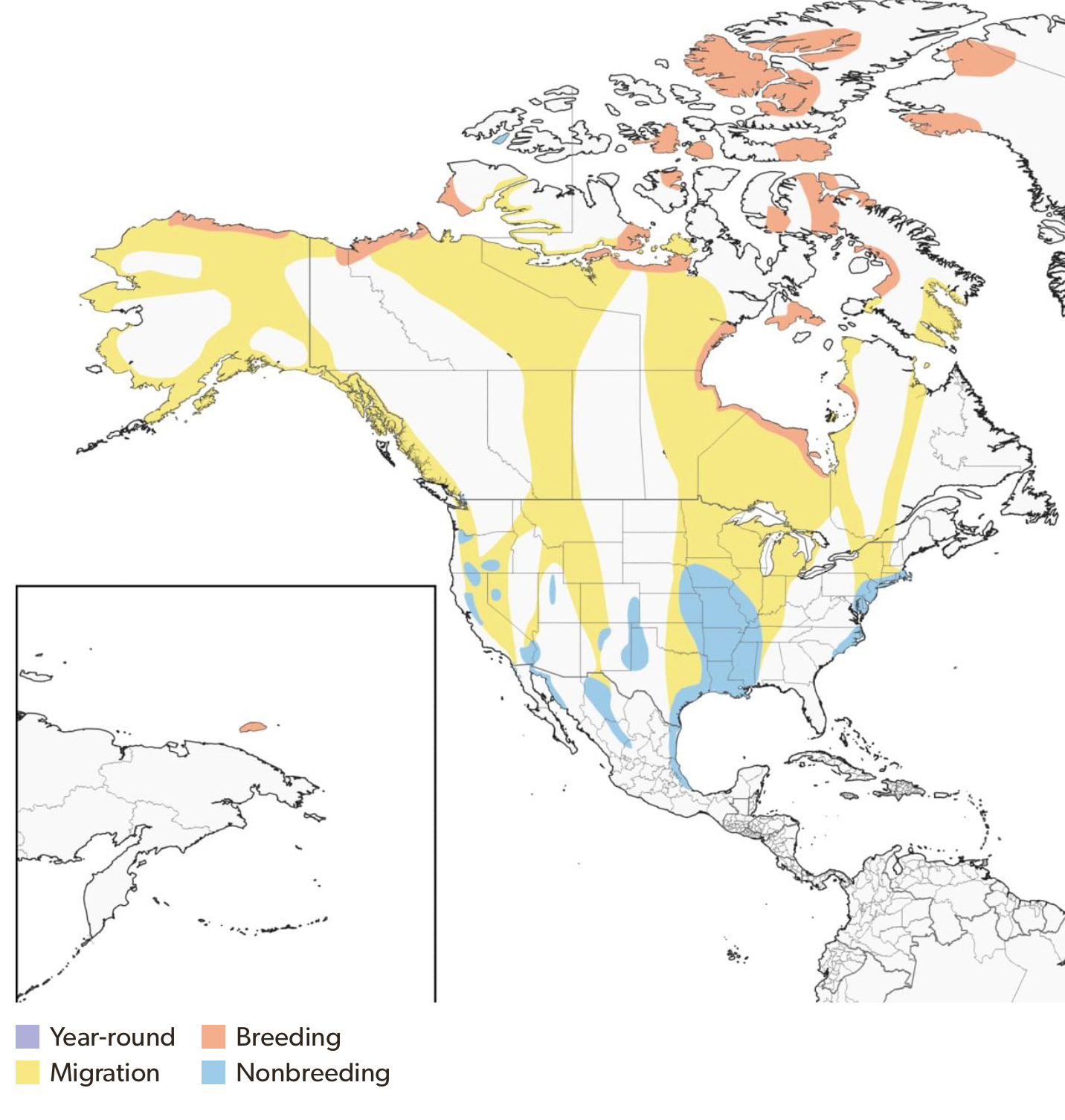 It is always amazing to me to understand how far these Snow Geese travel during their fall migration. Looking at the range map below, provided by the AllAboutBirds site, you can see the Snow Geese breeding/summer grounds colored in orange. Yellow marks the migration routes, and in general Snow Geese head due south from wherever they summer. That means the Snow Goose at this park had to travel 4000 miles from the north slopes of Alaska or from the northern border of Canada along the Arctic Circle. That’s a long way to go just to be eating the grass at a local park in Tucson.