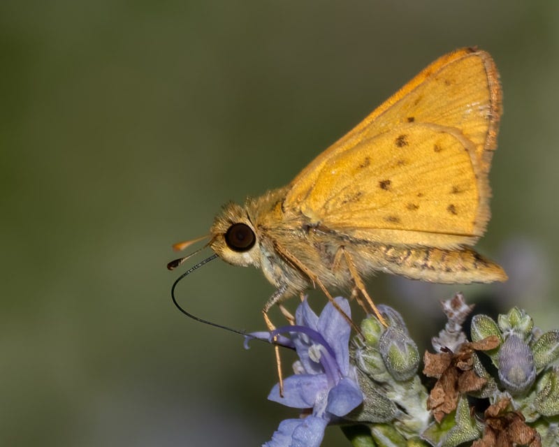 The Fiery Skipper is a unique looking butterfly. It is a small butterfly with small wings and a very large eye. Birds and Blooms magazine has a nice article telling us all about it.