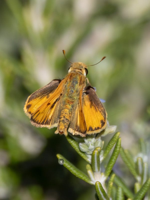 When the Fiery Skipper opens its wings, it looks to me like a fighter jet. It is triangular shaped and holds its hindwings flat and the forewings in a vertical position. Although it is a bit difficult to see, the forewings in this shot are being held straight up, perpendicular from the hindwings.