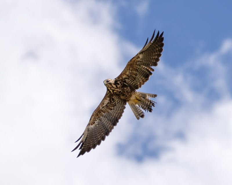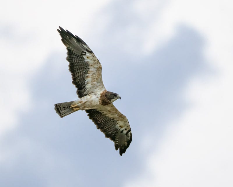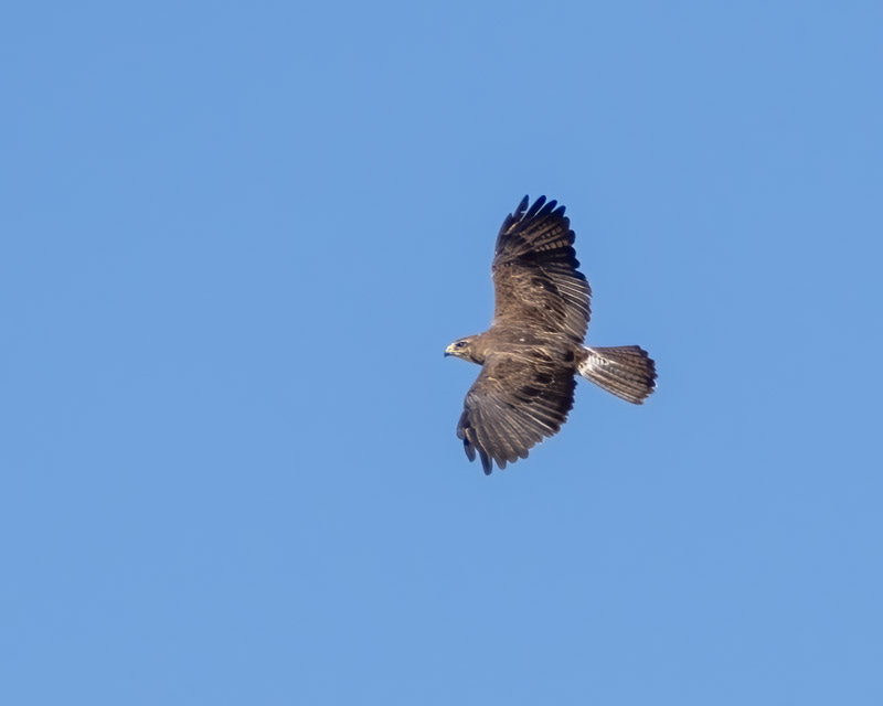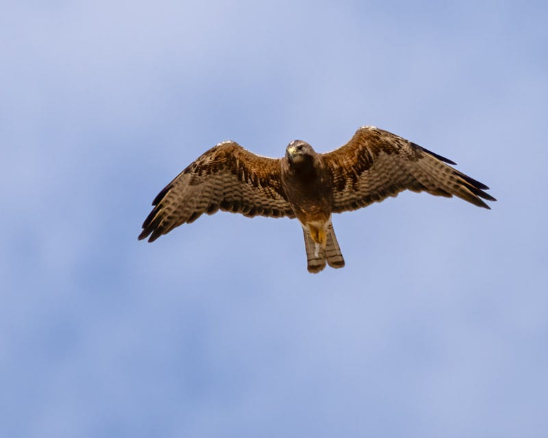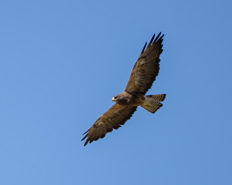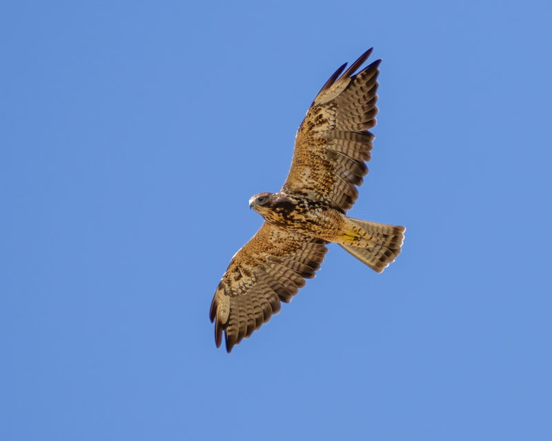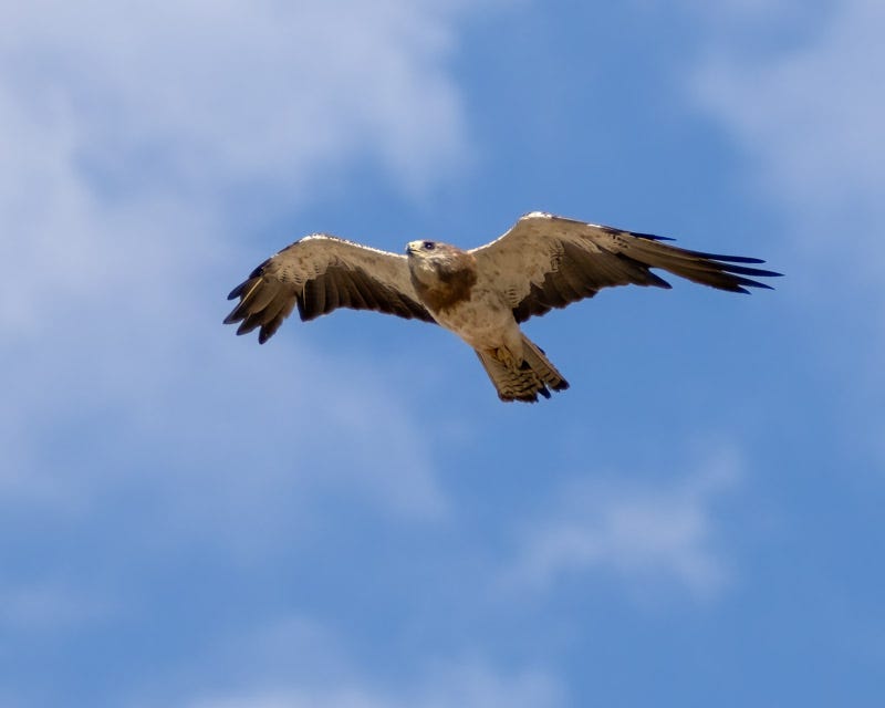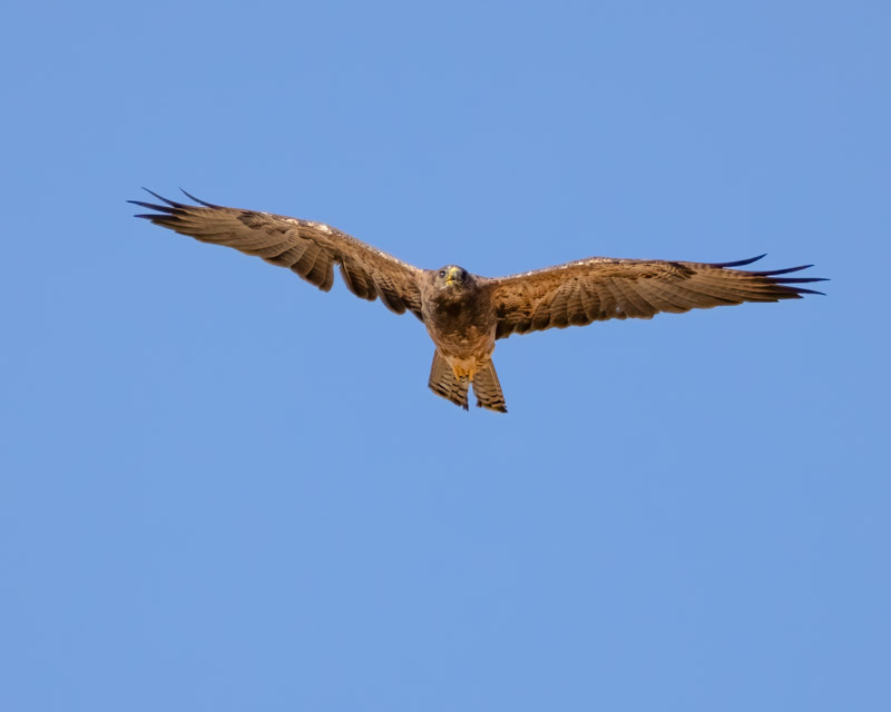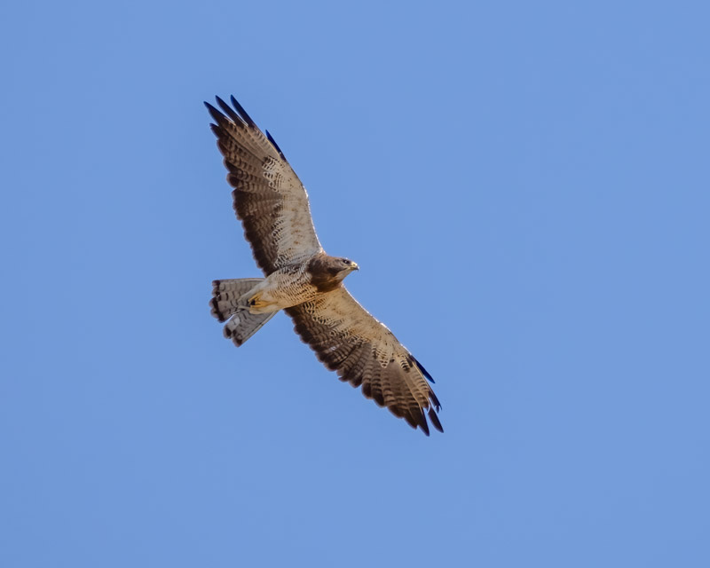 This Swainson's was gliding straight towards me. It has molted one wing feather and one or two tail feathers. New feathers will grow in soon
