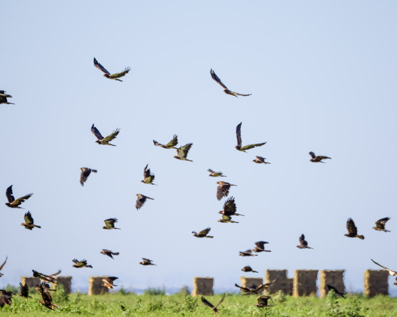 Swainson's Hawks migrate in large groups, often forming what is called a "kettle" in the sky. Their migration routes can mimic that of other raptors but they are also comfortable migrating over open country. Migration season has begun and reports of flocks or kettles of a hundred birds or more are beginning to be reported. One group of Swainson's that settled in this Pima County farmfield would periodically lift off and fly to another part of the farm.