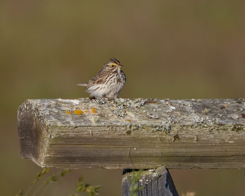 Savannah Sparrows are winter visitors to southern Arizona. You can find them in grassy and weedy areas at that time. I saw this one on an old, lichen covered worm fence near the Cattle Point prairie. The streaky breast and yellow spot in front of its eye helps to ID this bird.