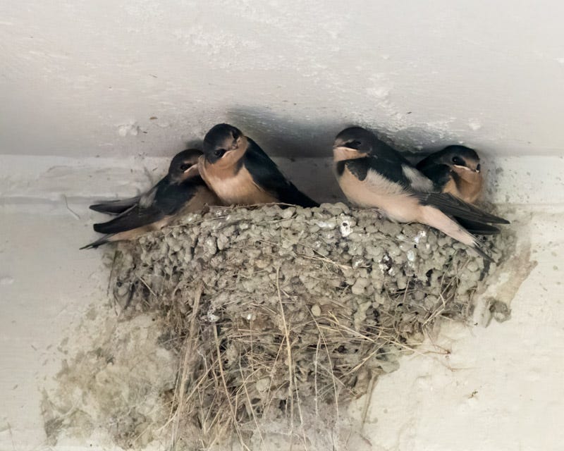 Barn Swallows get their name from their propensity to build their cup-shaped mud nests under human structures. This nest with four chicks was in an old abandoned building at Cattle Point. Birdnote talks about how Barn Swallows got their name and why we love having them around.