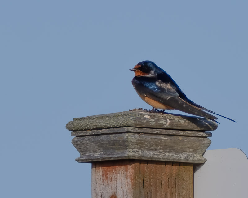 Barn-swallows are another bird that is more common in the Tucson area during migration and the summers. You can find them coursing over open areas and any water. The Swallows' backs have been described as iridescent or cobalt blue and they have "rufous or tawny" underparts. In flight, they are distinguished by their long, forked tails. This bird was perched at South Beach.