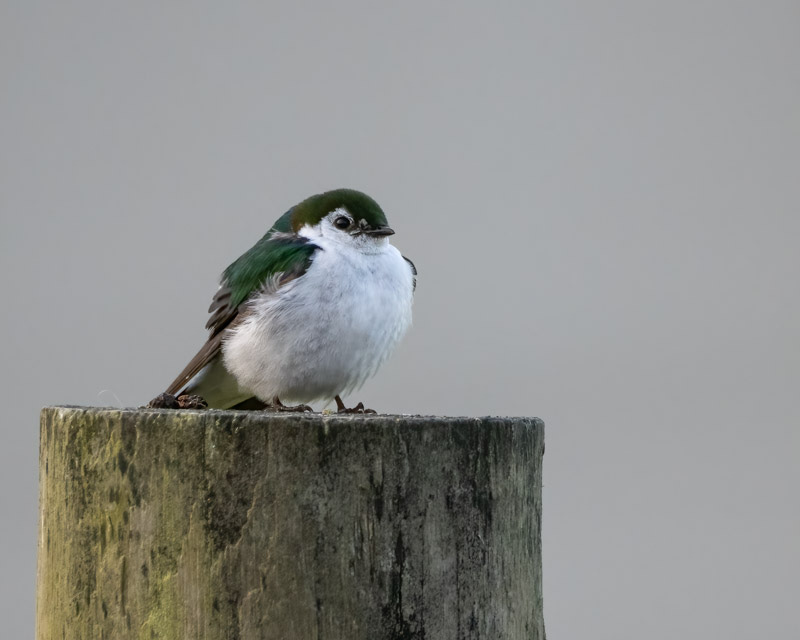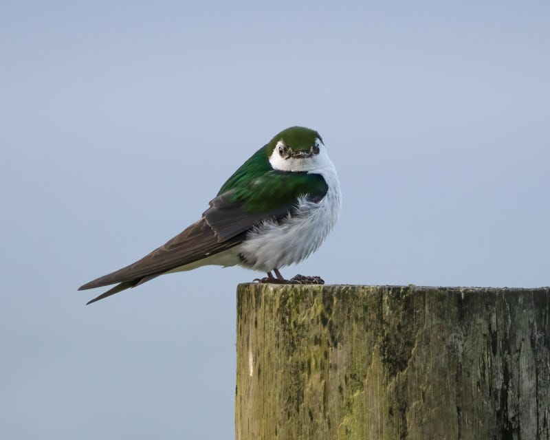 On the south end of the island, Violet-green Swallows were seen whizzing around through the air catching insects on the fly. Most of the time the Swallows look dark black but when the sunlight hits them just right, you can see the metallic green color of their head and back. (The violet of their name comes from their violet rumps- unseen in my photos.) In the air you can identify these birds by the white cheeks.