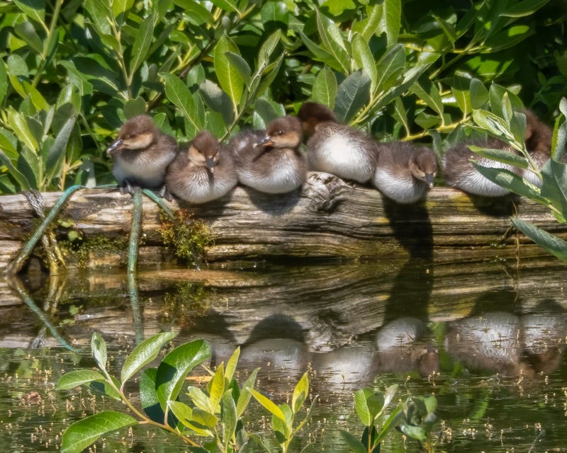 I previously shared a photo of the group of Hooded Merganser ducklings all lined up on a log in a pond at the Sculpture Park. After shooting that photo, I walked around the little cove that was sheltering them and got another shot of them. They were pretty darn cute.